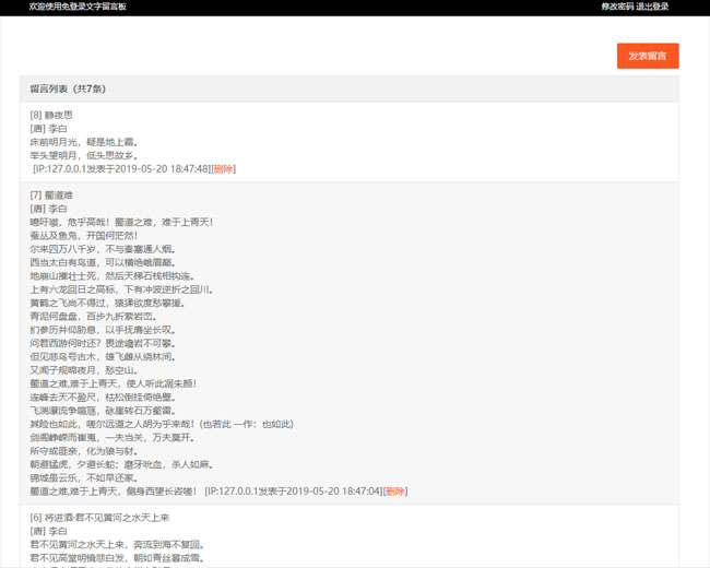 免登录文字留言板基于puyuetianPHP轻框架+SQLite数据库编写的留言板,界面简洁,纯文字留言,用户发布的内容进行了严格过滤,弹窗式留言发表,具有管理功能,管理可以删除用户的留言及修改管理密码,空间配置要求低,即传即用无需任何操作。