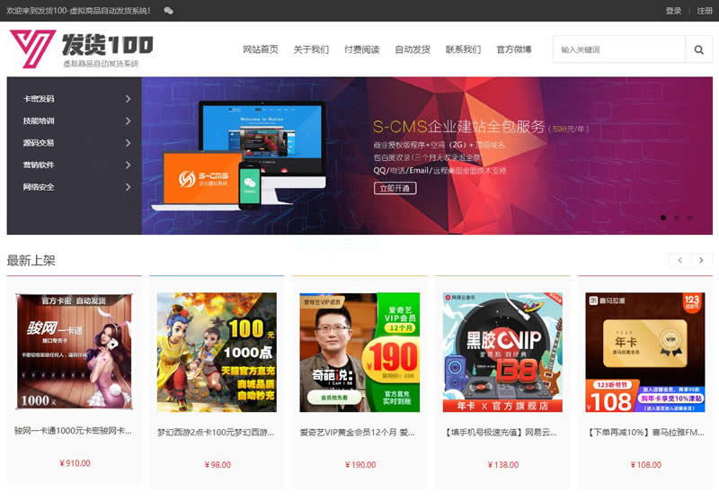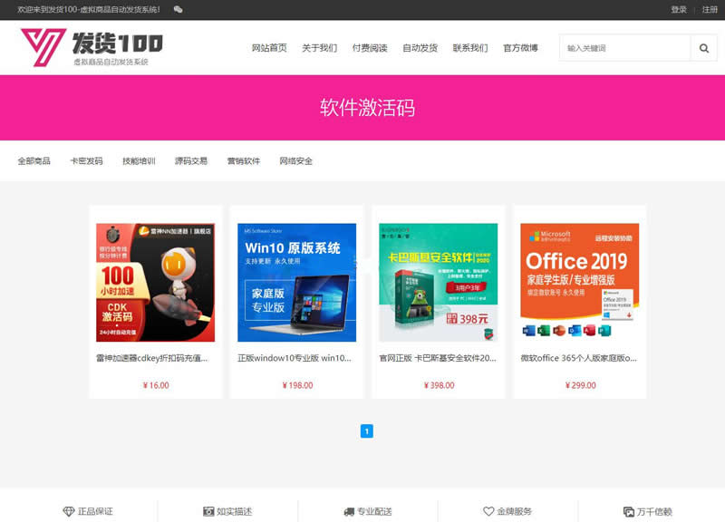 发货100-虚拟商品自动发货系统是一套功能强大的虚拟商品自动发货系统/文章付费阅读系统,无需人工值守,客户在线购买即可自动完成交易。支持缺货提醒/快捷登录/回收站/免登录购买等多种功能。