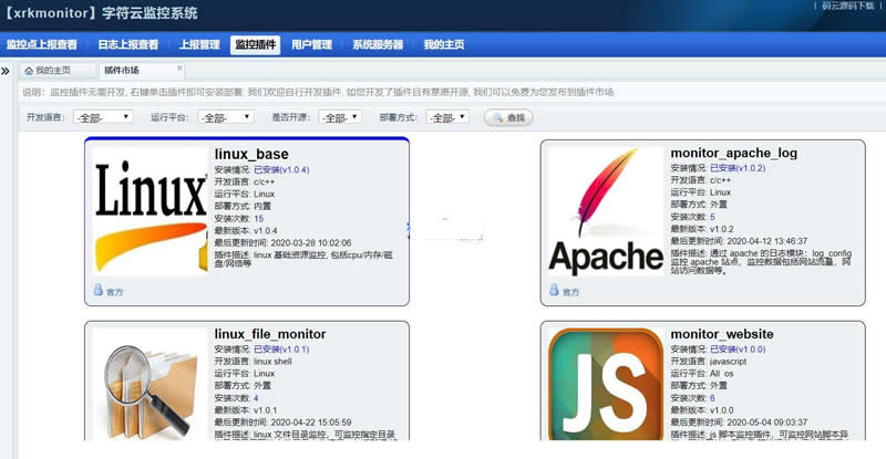 xrkmonitor字符云监控系统是一个国产开源监控系统,专注于通过监控系统对软硬件系统进行掌控以及系统相关数据的可视化,通过插件化进制完成对通用项目监控的复用,支持多种开发语言开发接口以便能为各类语言开发者所用,支持在线部署。