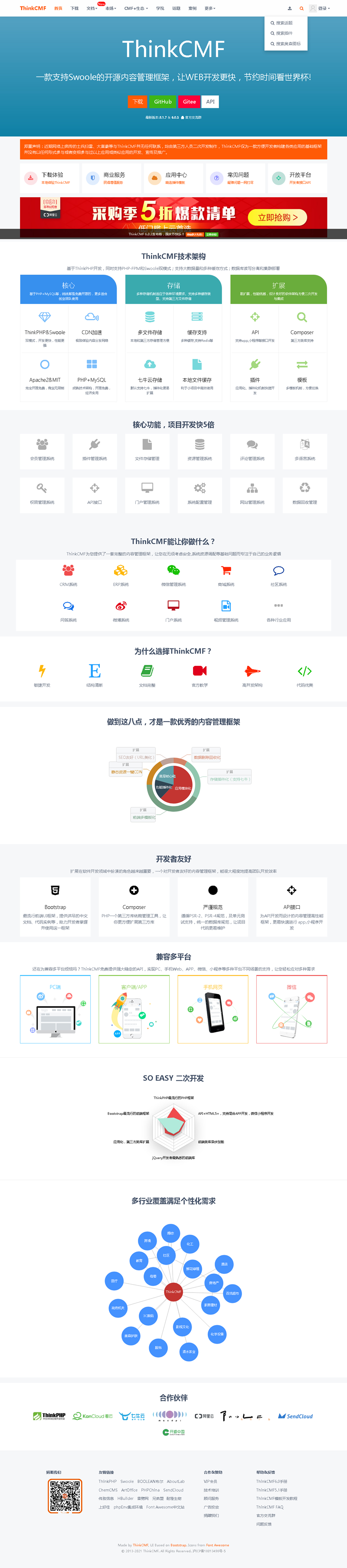 ThinkCMF是一款基于ThinkPHP+MYSQL开发的中文内容管理框架。ThinkCMF提出灵活的应用机制,框架自身提供基础的管理功能,而开发者可以根据自身的需求以应用的形式进行扩展。每个应用都能独立的完成自己的任务,也可通过系统调用其他应用进行协同工作。在这种运行机制下,开发商场应用的用户无需关心开发SNS应用时如何工作的,但他们之间又可通过系统本身进行协调,大大的降低了开发成本和沟通成本。