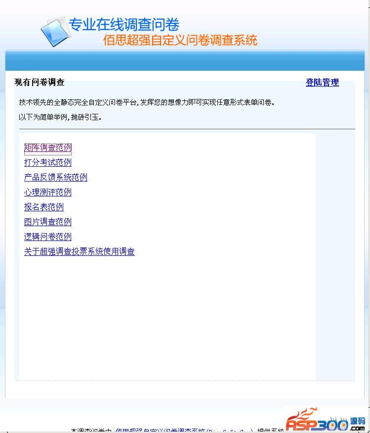 超强自定义调查投票软件可生成网上可见到的各类调查问卷的超强功能软件,即基于表单的所有系统都可用这个系统生成。