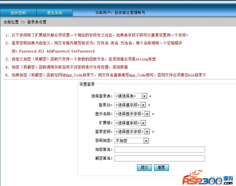 2. 后台密码支持自定义加密/解密算法,可以在设置登录表的时候进行配置;