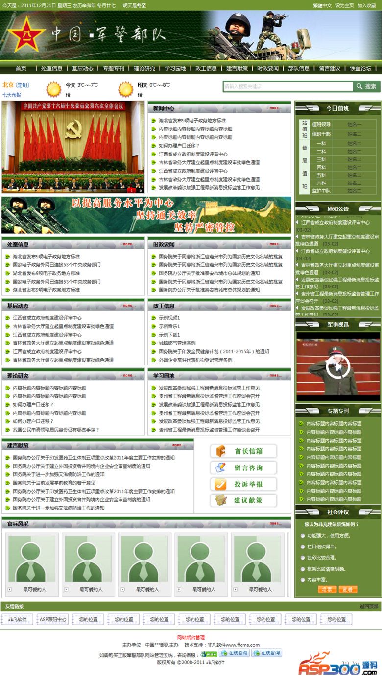 陆军,武警,特战部队网站管理系统模板。全站以军绿色为基调,配以我军战士作战图,即表现了战士飒爽的英姿,也体现了战士们英勇作战的景象。全站设计全面,分类细致,独有的天气预报系统彰显出本站的细节,该站能充分的了解到我军最新的动态。理论研究和学习园地加强了我军战士的全面水平,建议献策充分体现是我军人性化的管理和开放式的纳谏,官兵风采的展示让我们更进一步的了解了我们当代“最可爱的人” 。