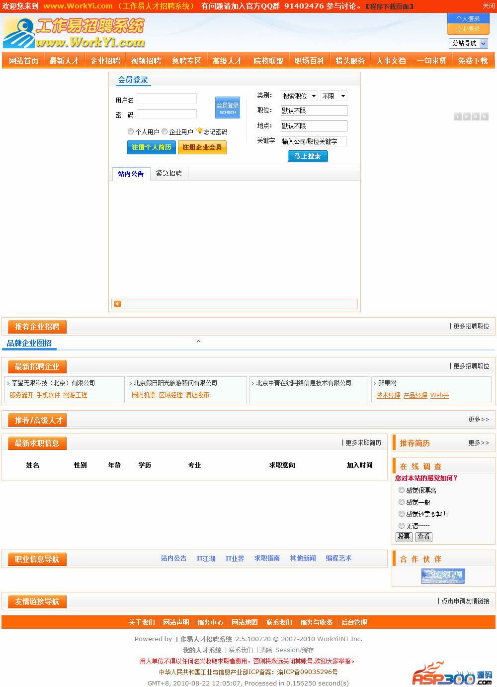 工作易人才招聘系统2.5是基于Win32平台,采用微软.Net2.0(Aspx)+MSSQL 2000(2005)为开发、运行环境,语言天生运算速度是ASP的2-3倍,安全和稳定性更是asp所 无法比拟和超越的。其安装简单方便,只需将程序上传至服务器后安装好即可使用;