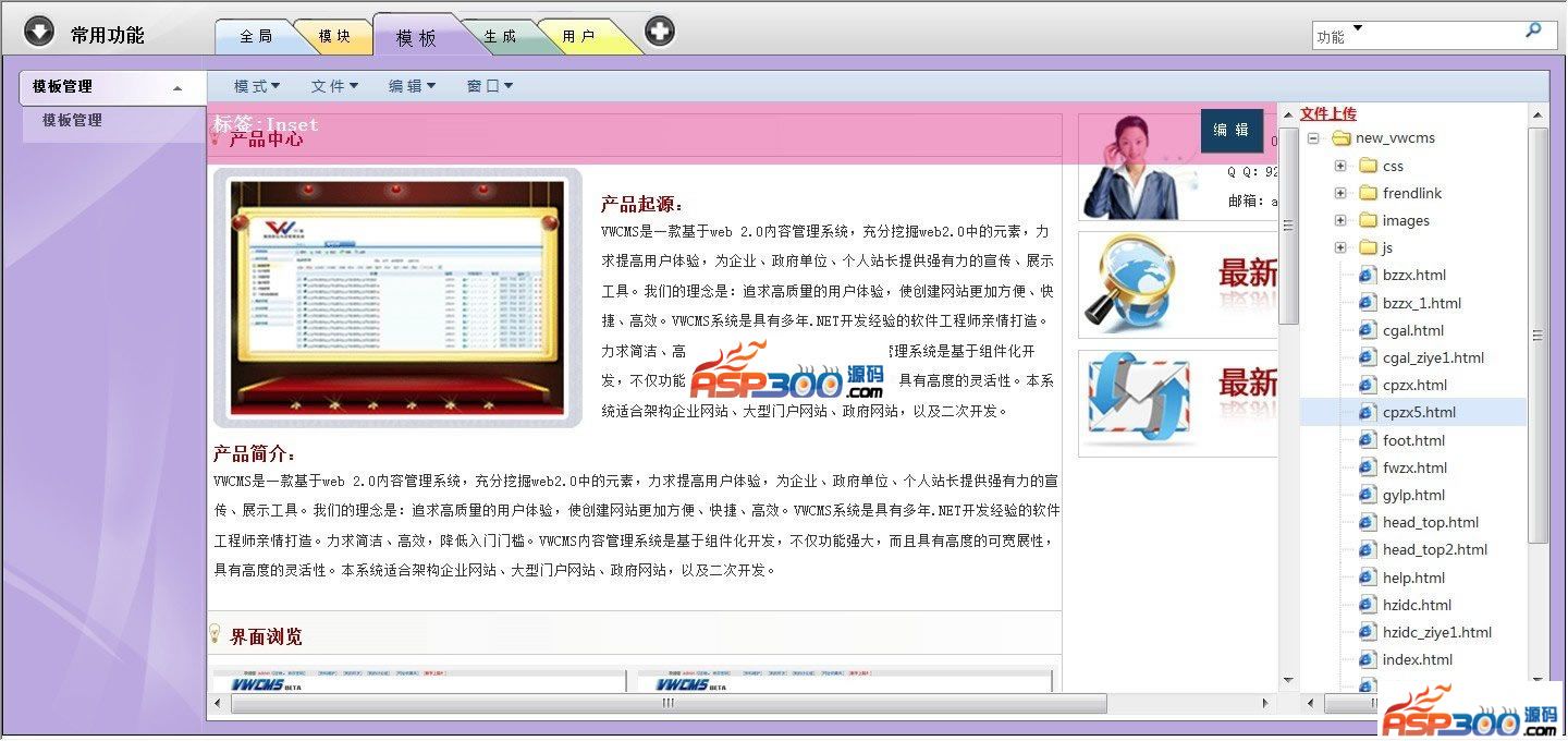 应用+突破+新概念VWCMS正式版隆重推出!全新应用市场模式:VWCMS(以下简称“VC”)全新开发WEB应用市场功能,提供更加广泛的应用供给使用者安装使用。开发者可以快速使用VC系统开发并设计模块功能,由于系统已经将前端技术封装,开发者仅需要将逻辑层及数据底层架构好就可以完成一套模块的开发;同时可以将模块上传至应用市场进行销售、授权等商业行为。使用者则可以登录应用市场购买或免费使用官方或第三方模块等。思想突破,打破传统:摆脱传统CMS技术难点,降低使用者门槛,让开发者和使用者进行“0”距离接触,充分满足使用者需求,实现用户需求百分百体现。模板应用商店内包含模板文件、标签、节点、栏目、模型等全套在内的应用,使用者再也不需要去为完全不适合模板苦苦的更改标签或字段来满足需求。同时模板创建者仅需要在系统内生成模板文件包就可以投放到模板应用商店出售或授权。实现小平台“聚钱赚”,开发者亦使用者,使用者亦开发者,在使用“VC”系统的同时创造更多的商业价值。崭新运营概念,升华建站价值:多种运营模块高效集成,让站点迅速成为一个云集强大功能的大型门户系统,并且无需整合就可以实现“一站通”,不但降低了开发使用门槛,同时还提高了网站的可运营性。强大的站群管理系统,可以迅速部署一个甚至几个站点,让使用者能够高效的管理多个不同类型的站点等。更多功能欢迎大家体验。官方网站:www.vwcms.com官方论坛:bbs.vwcms.com