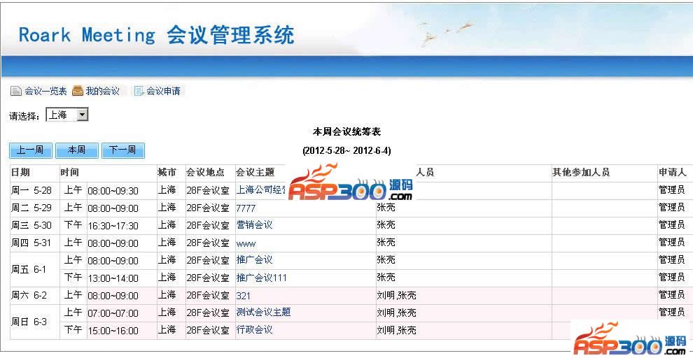 系统根据每天的会议自动与登录用户关联进行需要参加会议在一周会议表中颜色醒目区分,迅速定位当天,本周自己的会议安排。