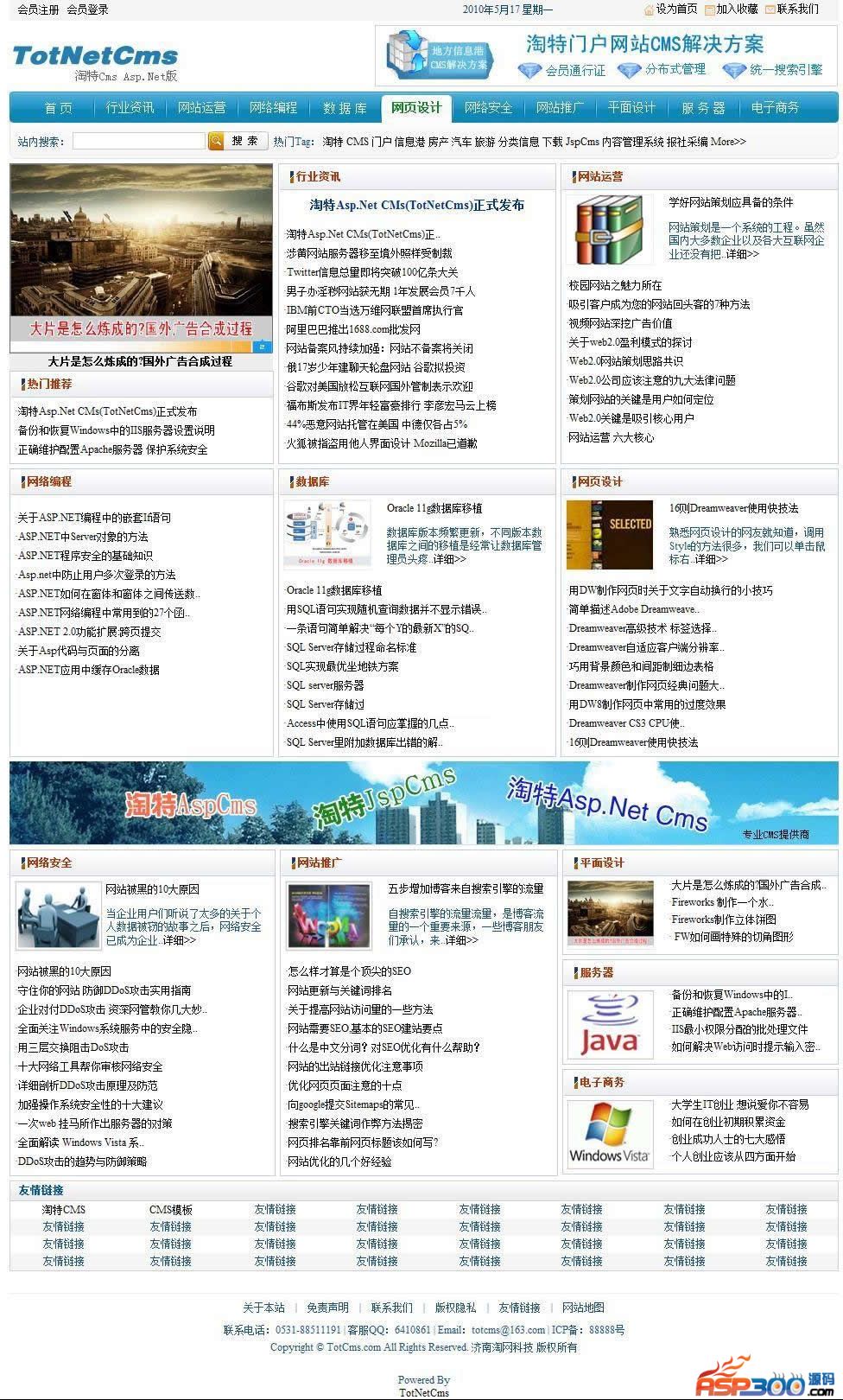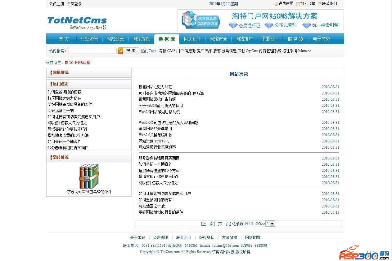 淘特Asp.NetCms(以下简称TotNetCms)是一套基于Asp.Net+C#技术的内容管理系统,是由淘特AspCms及JspCms的基础上发展而来。淘特CMS系列产品一直立足于门户网站解决方案,可有效实现百万级文章发布管理及内容快速模糊查询。淘特Asp.Net Cms(V4.0) 2013-8-19 更新说明:1、管理后台增加基于WebPart区块桌面管理模块2、增加管理员登录&操作明细功能3、后台UI美化,优化图片上传功能4、新增加KindEditor编辑器,可后台配置选择使用5、修改后台文章删除后,静态HTM文件没有删除的BUG6、修改文章内容过多时出错的BUG7、增加QQ登录接口8、增加会员站内短信模块9、增加群发短信和群发邮件模块