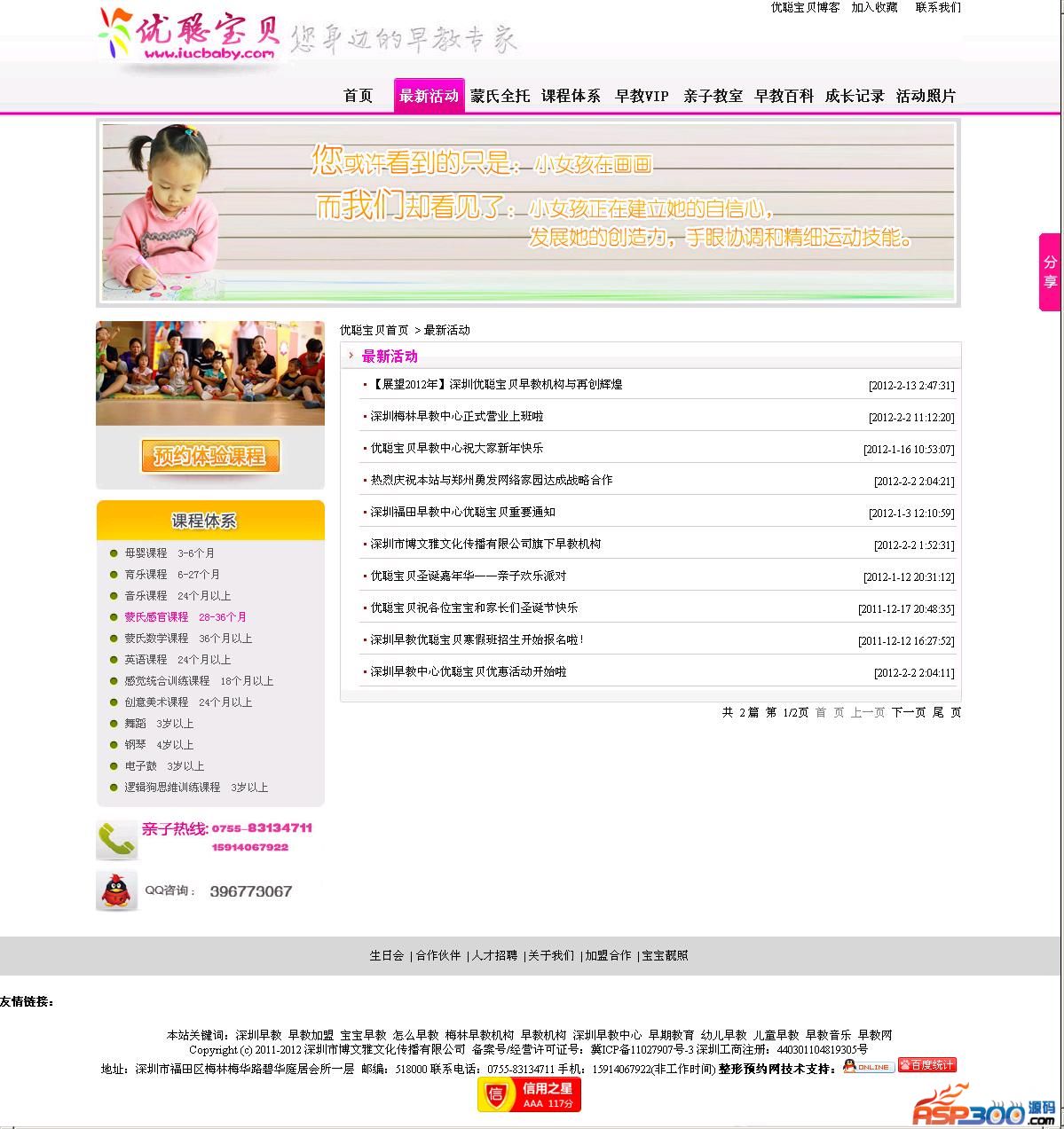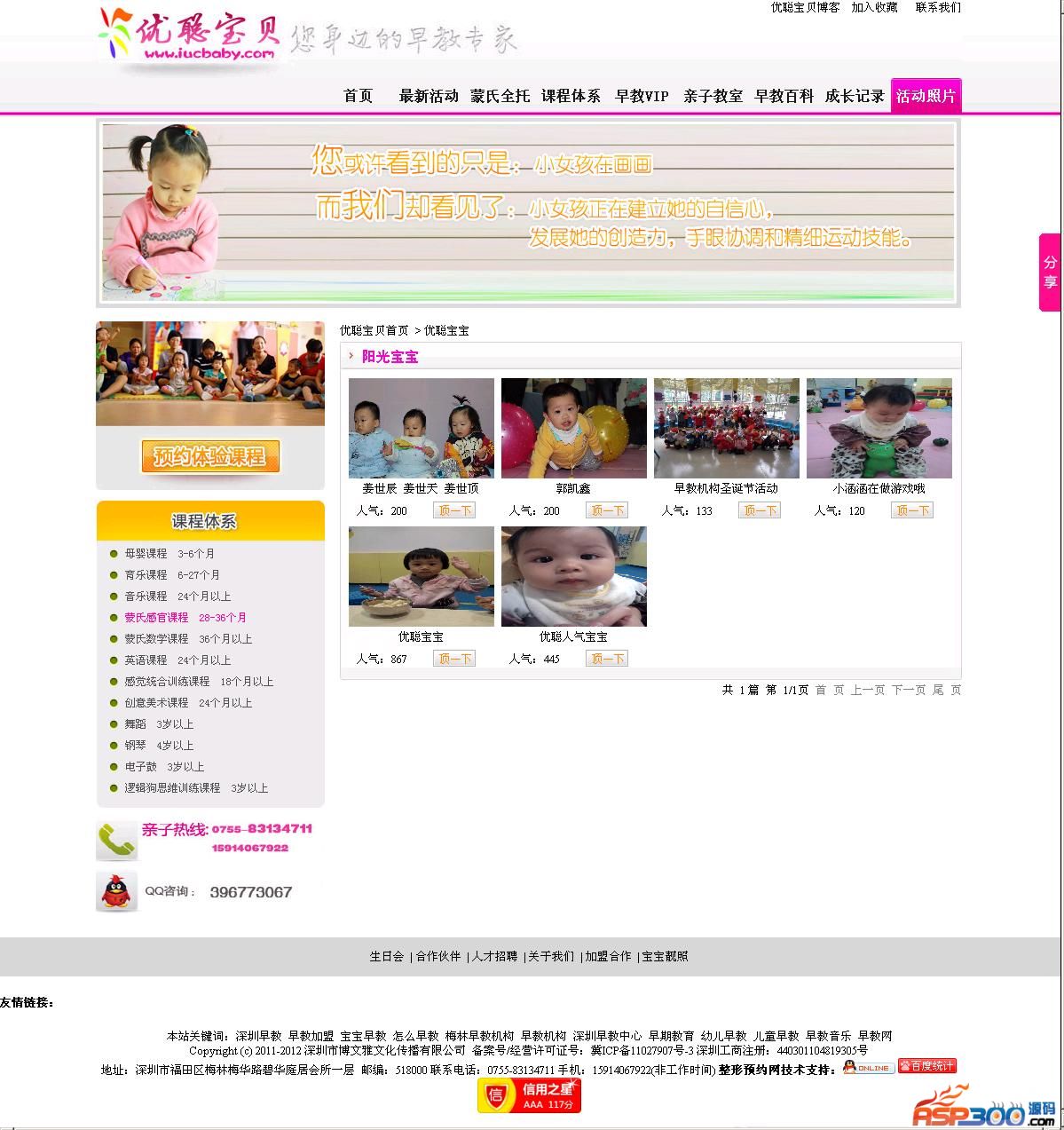 深圳市博文雅文化传播有限公司旗下优聪宝贝早教机构是由留学海外的幼儿心理学硕士引进日本七田真右脑开发及借鉴平井信义幼儿专家的教学理念结合中国宝宝的实际身心发展及中国家庭构成的特殊性。从关注宝宝的身心健康发展入手,研究整理了一套科学的婴幼儿教育指导方案。推出了《亲子潜能开发课程》、《亲子音乐课程》、《亲子英语课程》、《亲子生活美劳课程》等课程。
