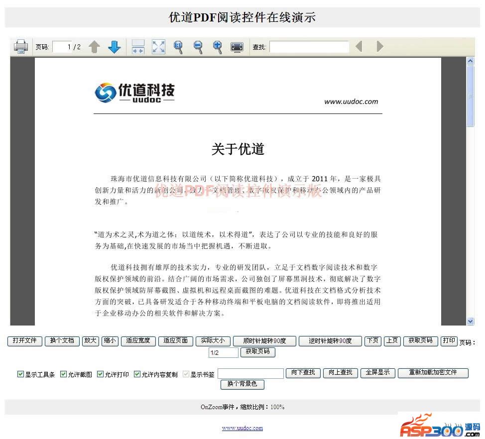 优道科技提供在线文档版权保护技术和解决方案,支持保护通过网页进行在线浏览的PDF和XPS文档。控件能完美解决PDF和XPS文档的在线版权保护问题。ActiveX技术支持无缝嵌入到各类网站和软件产品当中,控件小巧且功能强大,不需要在客户端再安装Adobe Acrobat Reader等其它PDF阅读器就能打开浏览PDF文件。完美支持大文件的在线浏览,简单的调用方式可以让您很方便就能做出一款适合常用需求的文档阅读器。