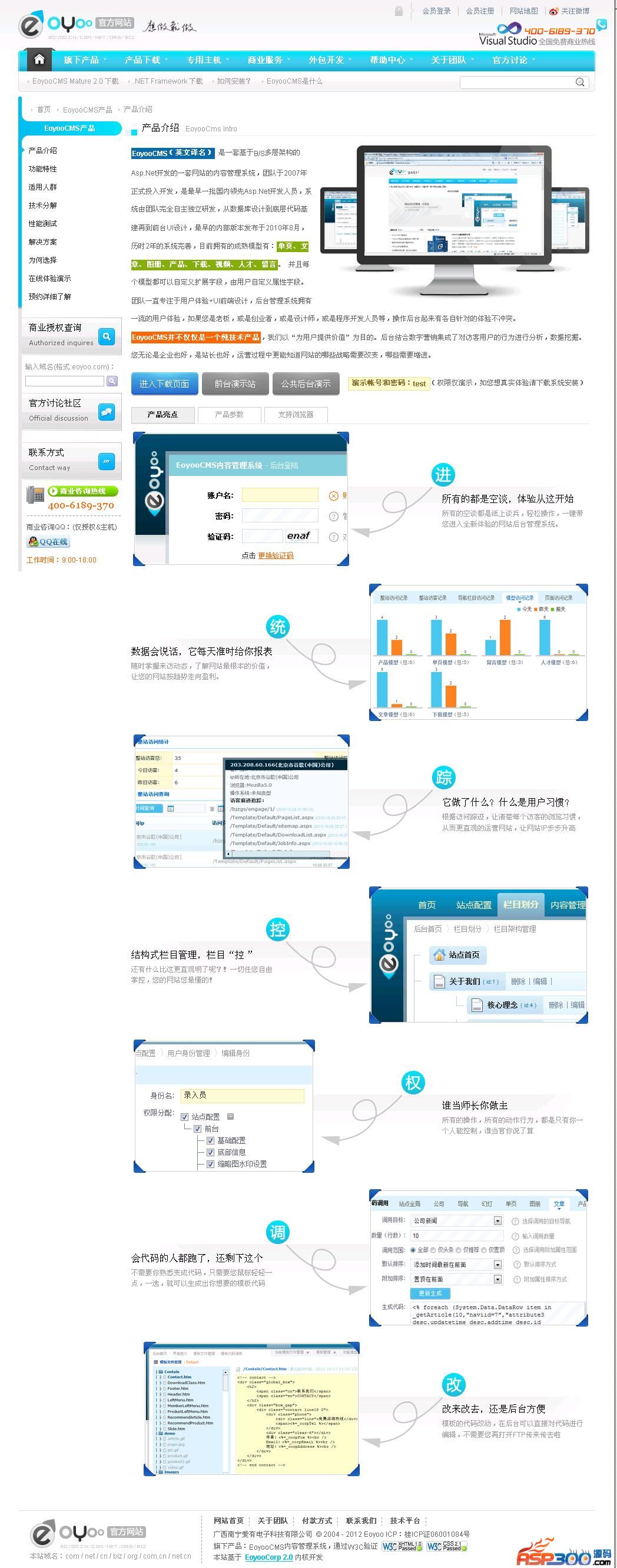 EoyooCMS(英文译名) 是一套基于B/S多层架构的Asp.Net开发的一套网站的内容管理系统,团队于2007年正式投入开发,是最早一批国内领先Asp.Net开发人员,系统由团队完全自主独立研发,从数据库设计到底层代码基建再到前台UI设计,最早的内部版本发布于2010年8月,历时2年的系统完善,目前拥有的成熟模型有:单页、文章、图册、产品、下载、视频、人才、留言。 并且每个模型都可以自定义扩展字段,由用户自定义属性字段。