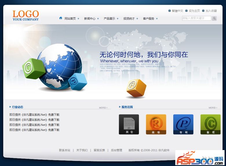 漂亮的文化,商标,版权公司的网站模板。页面简洁大方,商标,专利,版权以及其他项目的颜色分类,使人一目了然,独具特色。LOGO与主题区的浅色配以蓝白交加的地球和若隐若现的七大洲地图,充分映衬着“无论何时何地,我们与你同在”的主题。
