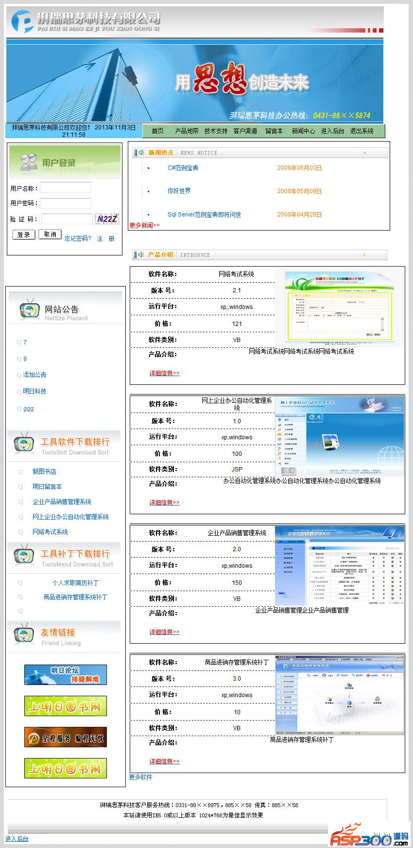前台展示区要求实现:首页、网站公告、新闻热点、工具软件下载排行、工具补丁下载排行、用户登录、用户注册、更改口令、找回密码、退出系统等到功能模块信息的显示功能。