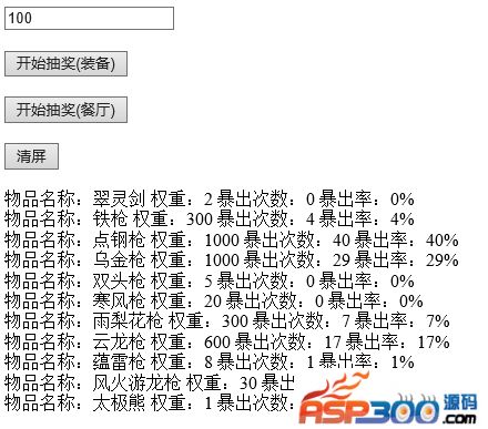 抽奖随机加权示例源码,根据装备的权重产生暴出率,好的装备会暴出率极低 前台可根据输入抽取的次数,展示暴击结果 示例有两个一个是装备的暴出展示,一个是餐馆抽中几率展示 下载地址 下载地址已转移到新版网站,请点击左上角-首页,在新版网站搜索此套源码的标题进行下载。