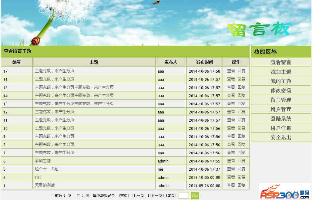 2、未登陆用户可以查看留言。登陆用户可以发布留言主题和回复留言,可以删除自己建言的留言主题。管理员可以删除主题和回复。