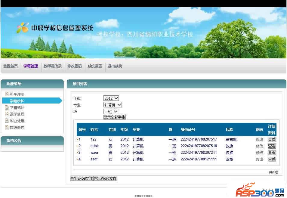 这是一款中等职业学校学籍管理系统源码,采用了典型的三层架构,功能比较完整,并且有比较完善的说明文档,比较适合用作毕业设计或者学习交流使用,值得推荐一下,感兴趣的朋友们不要错过哦。该源码的主要功能介绍如下:1、学籍管理:新生注册、学籍维护、退学办理、毕业处理、转班处理。2、教师通讯录:添加教师、修改、删除教师。3、修改密码4、系统设置:年级、专业、班、修读专业、教学点、学制、数据备份、数据恢复、数据导入。注意事项:1、后台管理员用户名密码均是:admin2、开发环境为Visual Studio 2008,数据库为SQL Server 2008,数据库文件在DB文件夹中,使用.net 3.5开发。3、默认数据库连接字符串在webconfig配置文件中修改。4、该源码比较适合毕业设计或者课程设计使用以及学习交流使用。