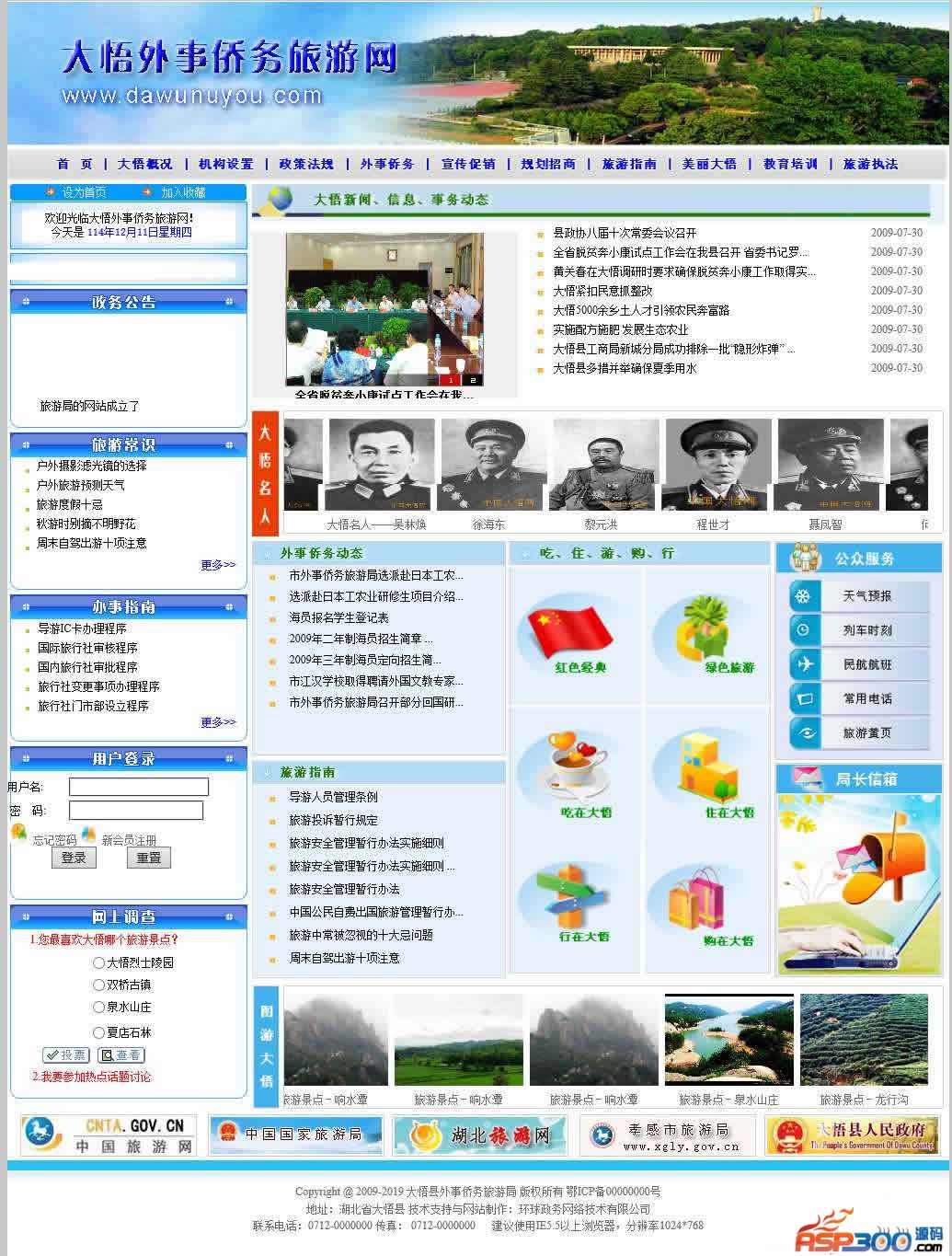 本源码是一个大悟县外事侨务旅游局官网源码,代码功能非常全面,特别适合学习和毕业设计使用,很棒的学习样品哦,本网站源码前台、后台功能完善,界面美观,曾作为商用网站,欢迎下载。主要功能:前台页面1、首页2、概况3、机构设置4、政策法规5、外事侨务6、宣传促销7、规划招商8、旅游指南9、美丽大悟10、教育培训11、旅游执法12、滚动公告信息13、动态图片显示14、登陆、注册后台管理1、退出管理,回到首页2、系统管理:管理员管理;会员管理;数据库备份3、新闻公告:网站新闻;网站公告;会员留言4、栏目信息:简介;机构设置;政策法规;外事侨务;宣传促销;规划招商;旅游指南;教育培训;旅游执法5、页面信息:办事指南;旅游常识;红色经典;绿色旅游;吃;住;行;购物6、名人风景:名人;风景;美景注意事项:1、开发环境为Visual Studio 2010,数据库为ACCESS,使用.net 2.0开发。2、管理员:admin 密码:admin8883、数据库文件在APP_Data文件夹中
