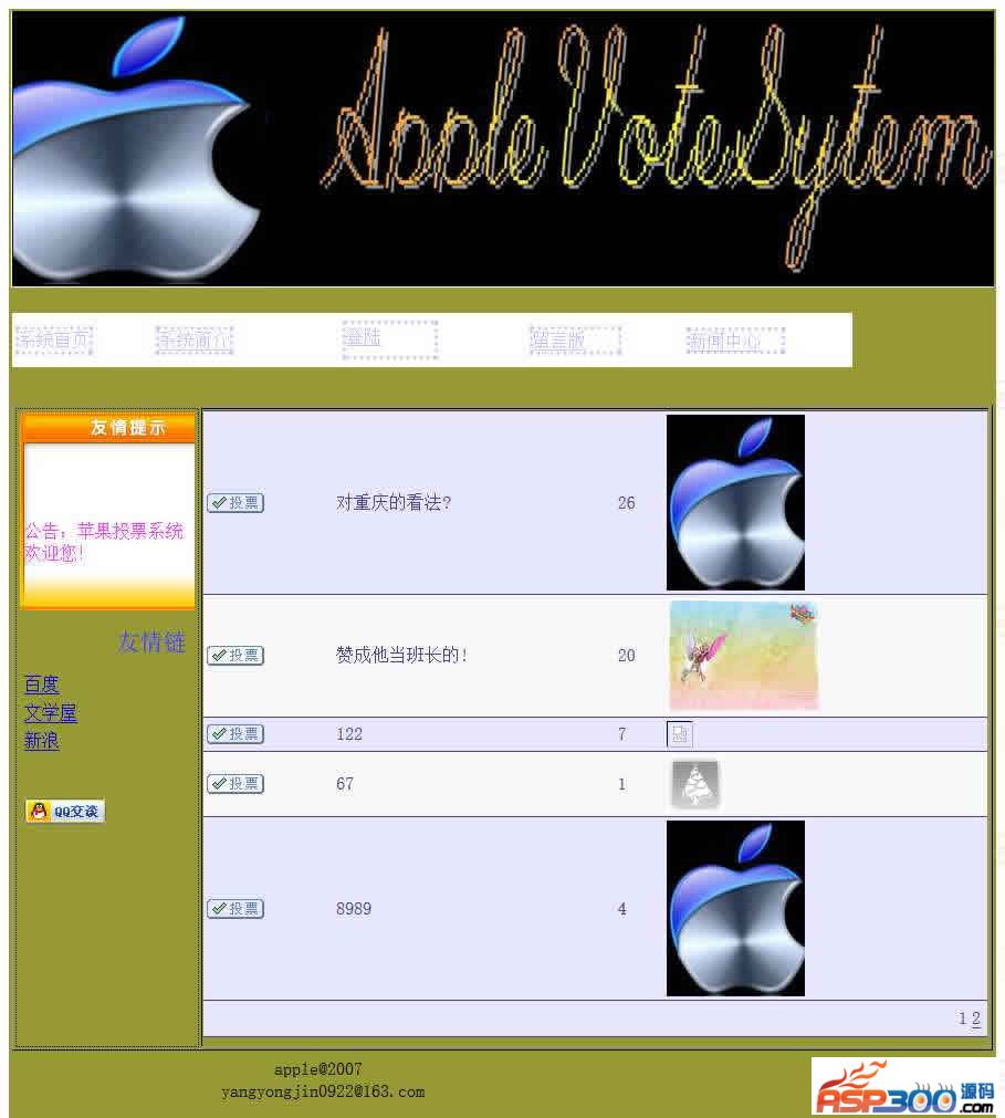 苹果投票系统开发需要用到的语言是C#,采用了当今最为流行的ASP.NET技术,在线投票功能是网站应用程序最常用的功能之一,也是网站应用程序开发常用的功能模块。本项目附带详细的设计文档。