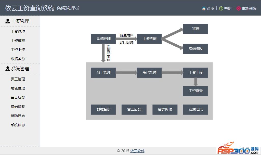1.设有3种不同的角色,系统管理员,部门管理员与普通用户。系统管理员可以添加各部门管理员、上传工资表等,部门管理员可编辑对应部门的员工与工资,员工可查看自己工资。