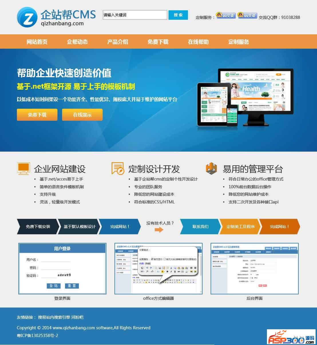 企站帮CMS是一款基于.NET 2.0平台,面向中小型网站而研发的建站系统,其主要特点是轻量,灵活,可以满足各种二次开发需求。企站帮CMS是完全开放源代码的,您可以基于此基础快速二次开发!特点:1、网站布局:采用目前最先进的布局方式DIV+CSS,符合W3C的标准和Web2.0的风格。2、程序设计模块化,增强了用户体验,缓解了服务器压力。3、安全性:采用了静态生成技术,安全和速度都有保证。4、扩展性:布局采用DIV+CSS和程序设计模块化,大大的保证了程序扩展性和稳定性。