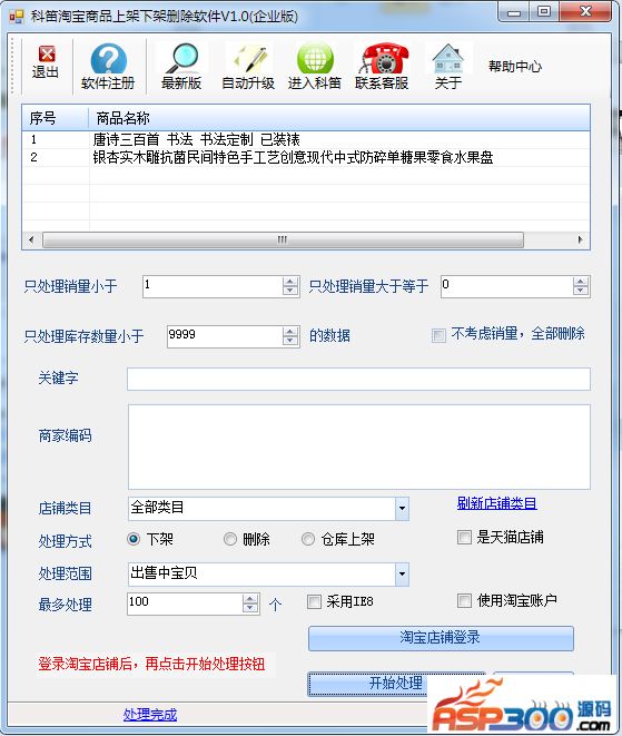 科笛淘宝宝贝上架、下架、删除软件(网页模式,无需 API),不需要申请淘宝API,直接就可以使用,对于宝贝数量很多的店铺,使用该软件可以大大提高效率 下载地址 下载地址已转移到新版网站,请点击左上角-首页,在新版网站搜索此套源码的标题进行下载。