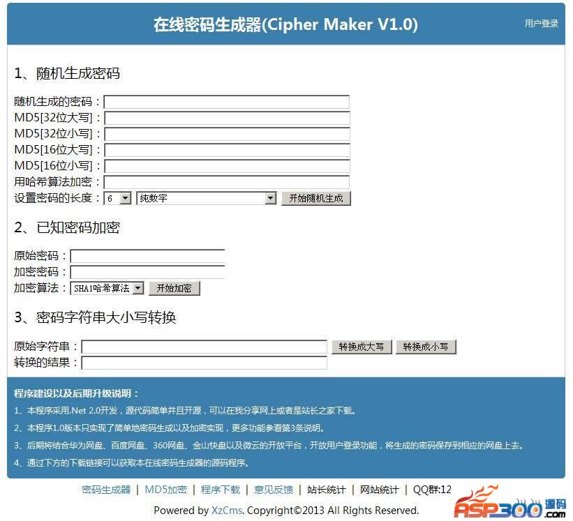 在线密码生成器(CipherMaker)是以.net进行开发的密码生成器,它可以随机的生成任意密码并加密成MD5格式,也可对指定的密码进行MD5的加密,还可对原有的加密字符串进行大小写的转换。