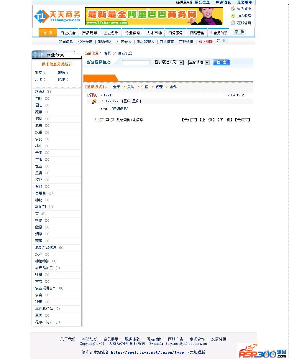 2、商业机会栏目功能有:二级分类,已经带有详细分类的数据库,后台可以更改增加操作,并可以推荐公司,栏目分为分类显示信息,