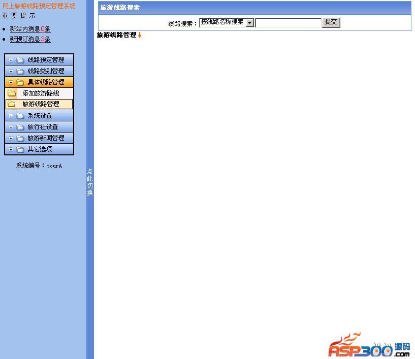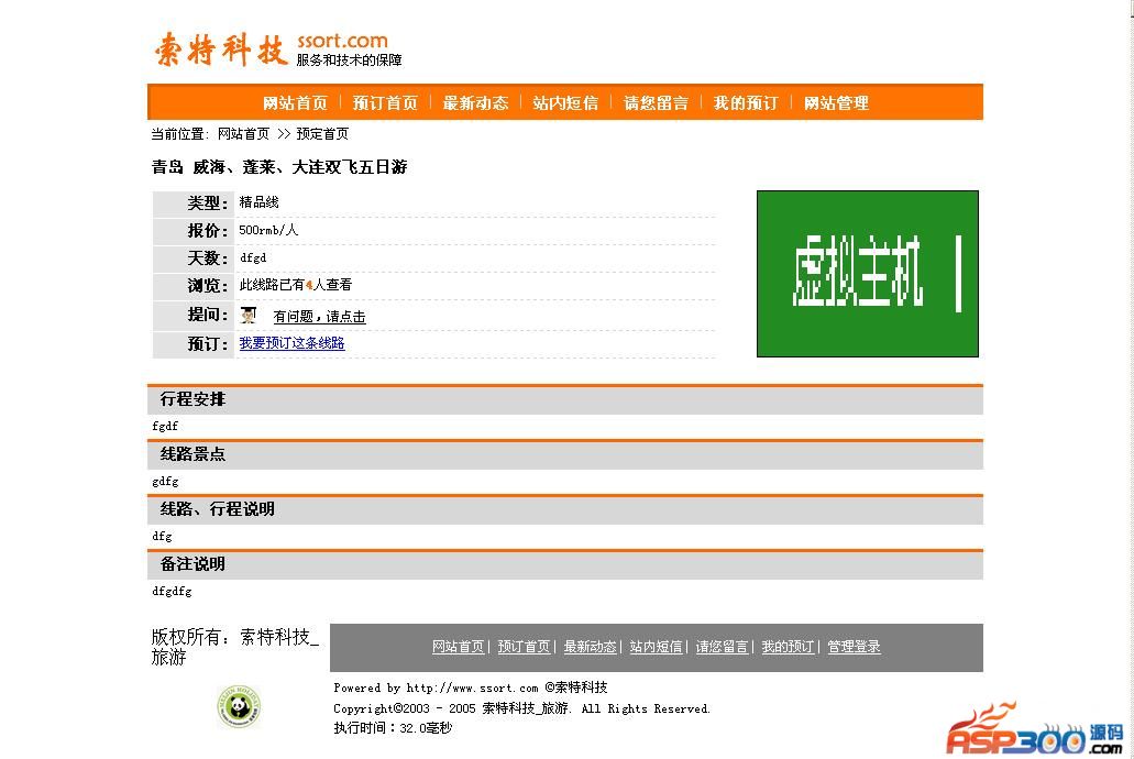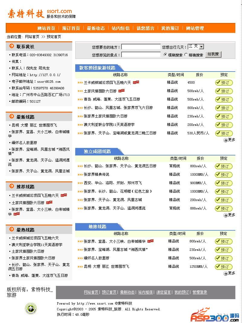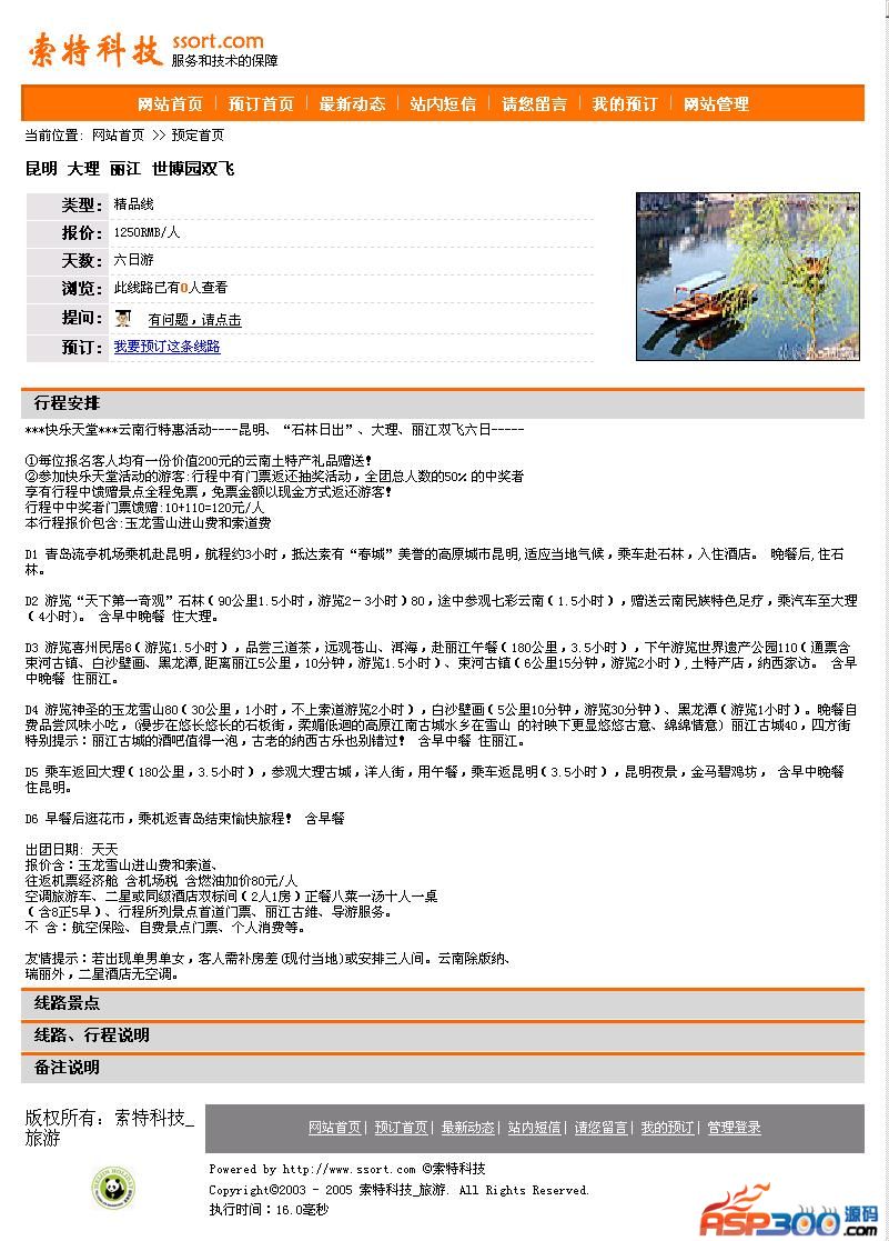 索特科技旅游线路发布管理系统是一套专门解决旅行社网上预定、发布、管理线路的强大系统,系统基于ASP+ACCESS数据库开发,功能强大,操作方便,系统设计完全符合旅行社的运做模式。系统着重体现易操作性,只要您会打字,便操作。