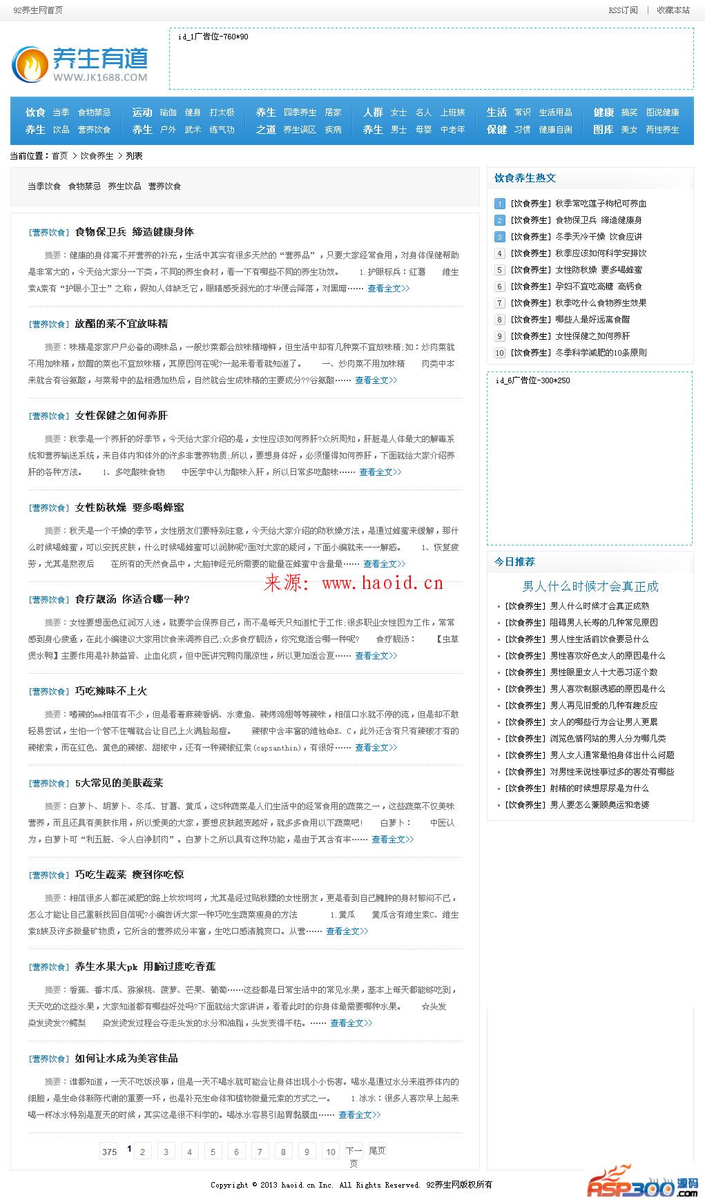 仿1688养生网 拥有7个频道,90余个子栏目,涵盖了养生,健康,保健,两性相关的各方面资讯,近几年人们越来越注意养生保健相关资讯,养生相关词汇搜索量节节攀升。
