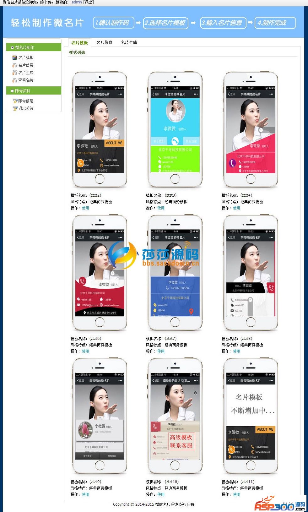 其他说明:6月最新微名片|微信电子名片|二维码名片系统,后台可一键生成卡密,方便用户购买。功能很强大,支持手机QQ、微信扫一扫,可一键添加名片信息至通讯录,修复了5月版本不能注册的BUG,源码不错,分享给大家!