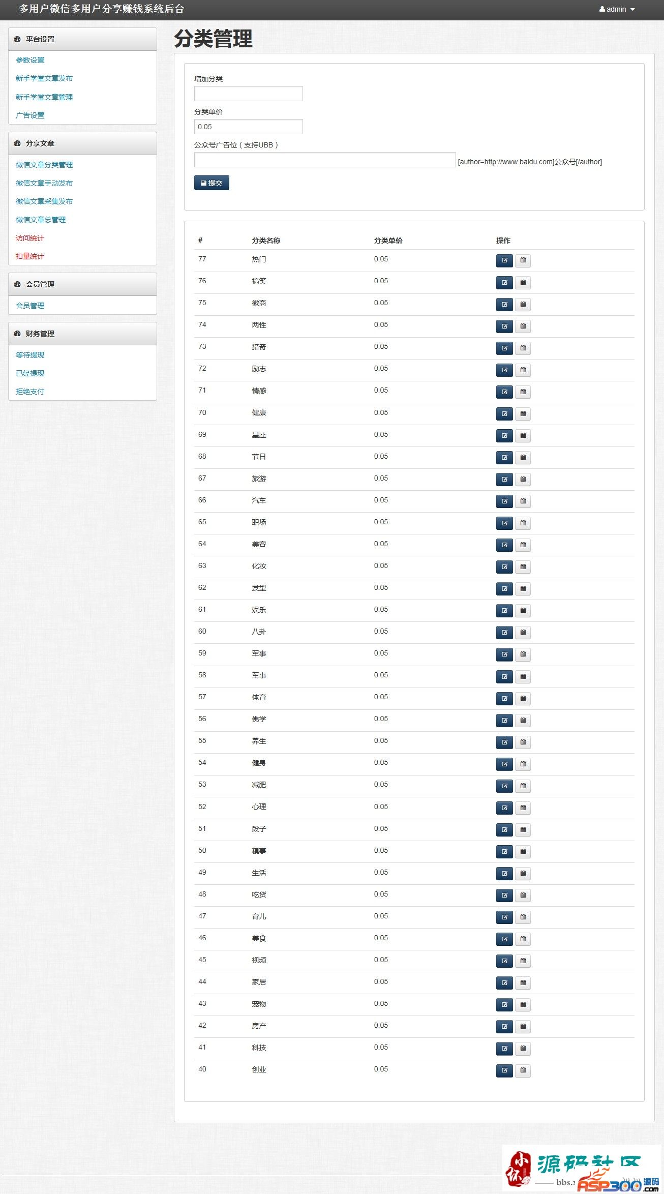程序为一套在微信客户端通过转发文章赚钱分享源码,内置了防作弊、防刷功能另外支持系统、文章可以双域名,方便快速切换绑定的域名,防止被举报。通过此套程序会员可以转发文章进行赚钱。我们付佣金给会员的模式进行微信营销,可以快速积攒人气,很方便进行一些推广活动,分享给大家啦~~ 下载地址 下载地址已转移到新版网站,请点击左上角-首页,在新版网站搜索此套源码的标题进行下载。