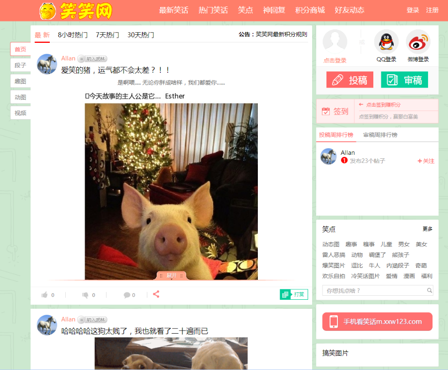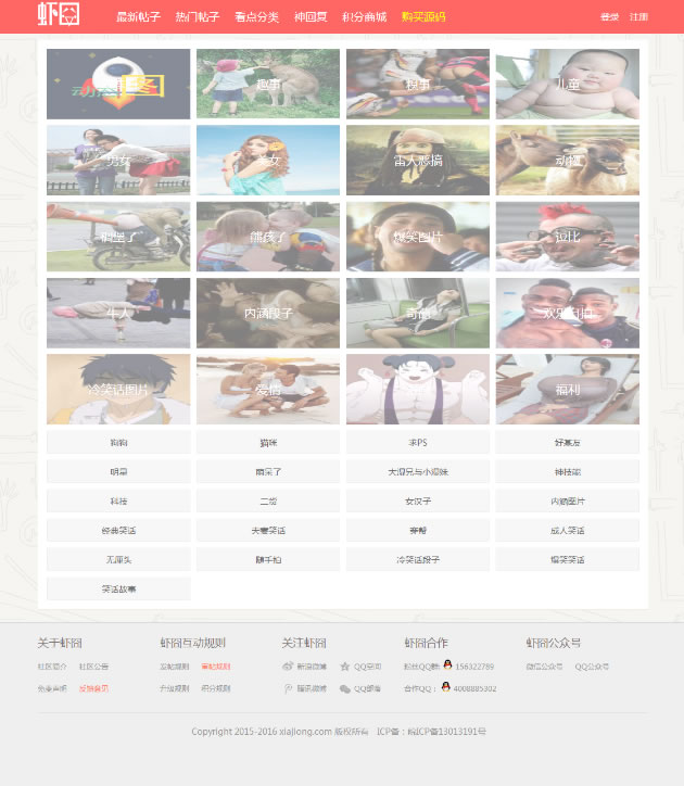 1、会员中心(发帖、审贴、动态、我的投稿、站内消息、我的礼品(积分记录、兑换记录)、个人资料(资料修改、头像修改、密码修改 、关注)2、前台(笑点、登陆、注册、找回密码、第三方登陆绑定)打赏功能3、第三方(QQ登陆、微博登陆 )积分系统(兑换、签到、邀请)4、内容功能(文字、图片、动态GIF、视频)广告系统、积分商城5、后台可切换上传方式:本地存储 和 七牛云存储6、用户手机端也可以发布内容哟!去试试吧。