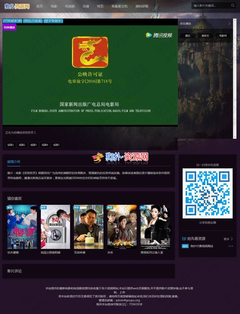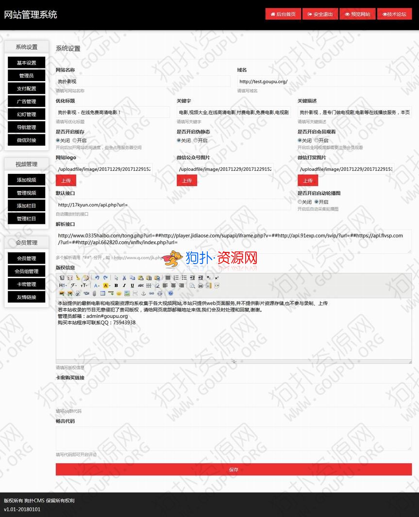 狗扑影视系统freekan二次开发V1.0版,在原版的基础上增加了VIP会员模块,卡密充值模块,付费观看模块,可自行添加视频,修复了视频解析接口,上万部视频一键更新,无需手动添加!源码全解密,无任何加密模块,VIP视频站的福音! 下载地址 下载地址已转移到新版网站,请点击左上角-首页,在新版网站搜索此套源码的标题进行下载。