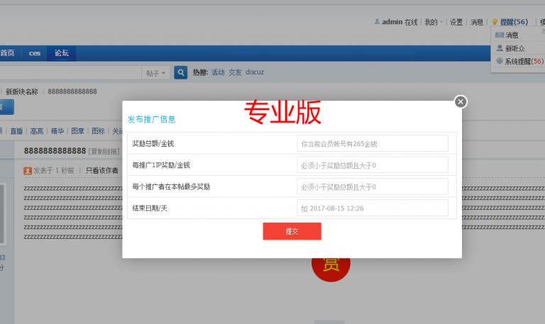 8、具有权限的帖子作者,可在自己贴内看到【发布推广信息】的按钮,自行设置总的奖励金额、每引入1ip的奖励额、每个用户累计可在本帖获得的奖励额、截至时间