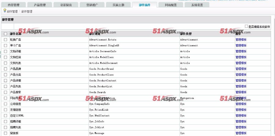 5、所有页面由部件组成,部件还可以选择不同的模板,并且部件支持全站拖动和热插拨,类似淘宝