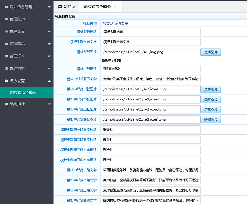 2.新增响应式模板 注:该模板数据需在后台-模板设置-响应式蓝色模版 里面设置
