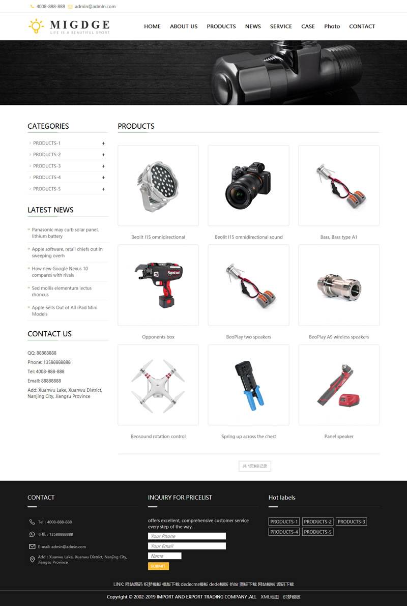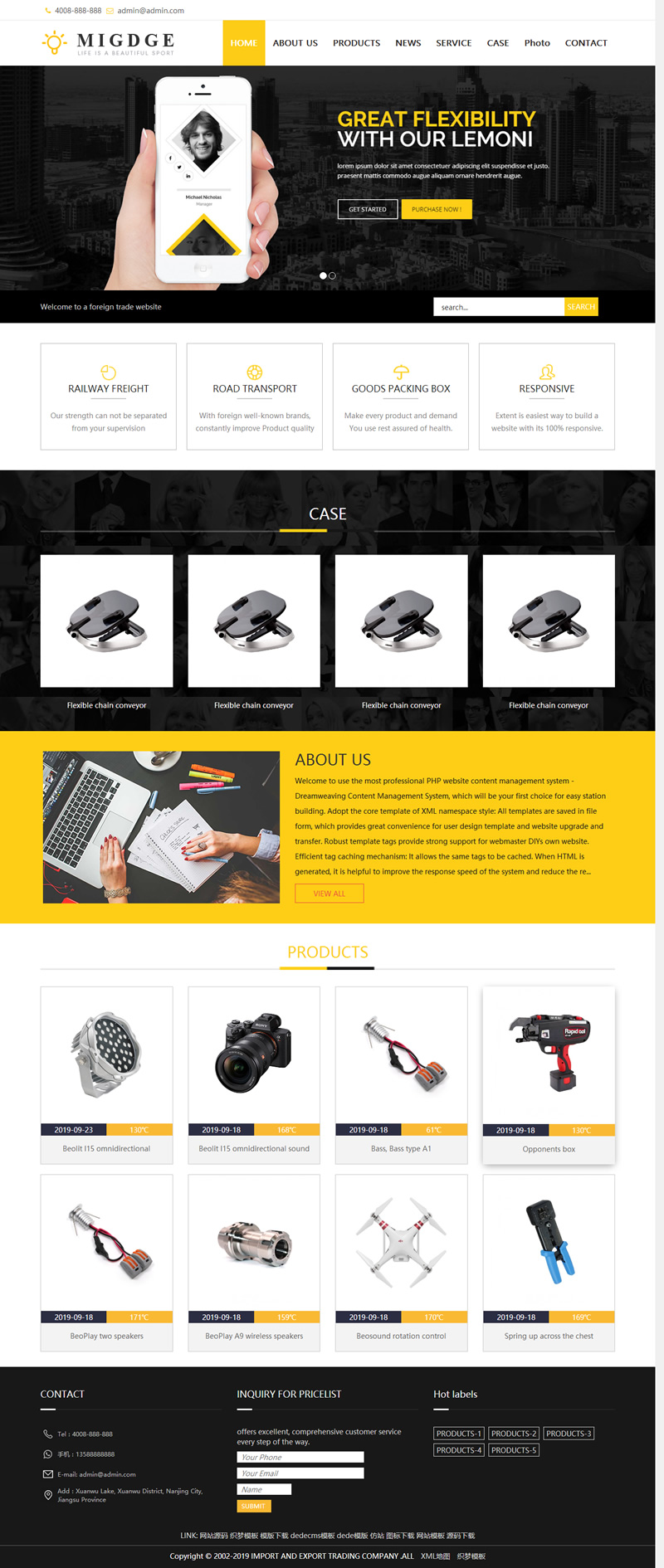 3、适用于五金外贸织梦模板、电子产品外贸网站源码;