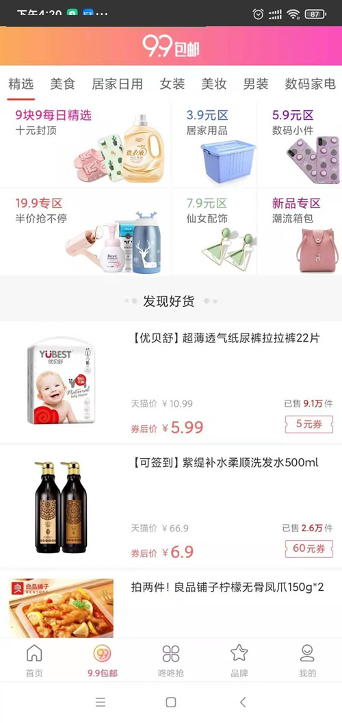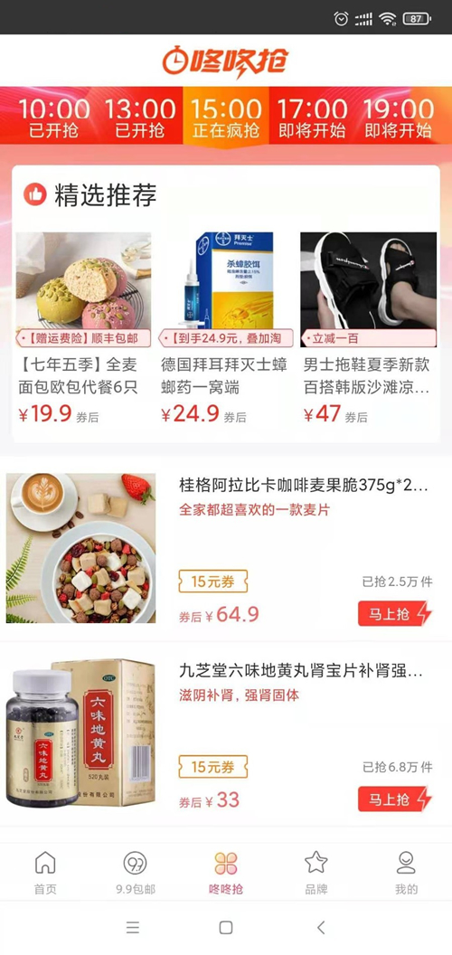 2.这款1元抢购app的主要功能比较丰富,在首页,是低价商品分类,和常见的商城一样,比如美食、居家、女装、男装、美妆、数码家电等,然后是折上折,每日半价商品分类,在购买商品的时候可以用优惠券,然后是9.9元包邮区,这个大家都比较熟悉,再者就是定时抢,一般设置为整点开抢,每次开抢的商品不太一样,第四个板块功能是品牌专区,适合不同人群的需求,这款app还有聚划算、淘宝直播的入口,方便大家在不同平台选购商品。