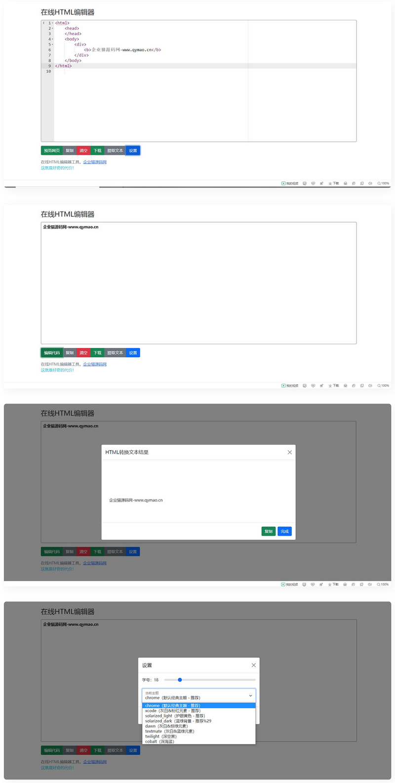 支持一键清空代码,支持恢复上次编辑内容及光标位置,支持一键HTML转换文本,支持一键下载代码文件