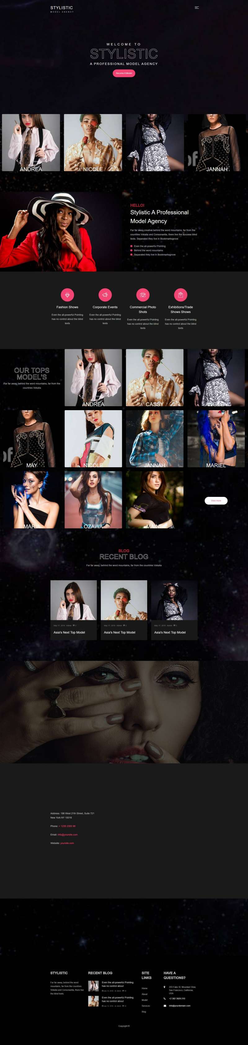 一款高级大气有全屏背景的Bootstrap4模特经纪公司网站模板,它简单,干净,易于编辑,可适用于模特经纪公司,模特展示,模特学校、时尚杂志等网站。 下载地址 下载地址已转移到新版网站,请点击左上角-首页,在新版网站搜索此套源码的标题进行下载。