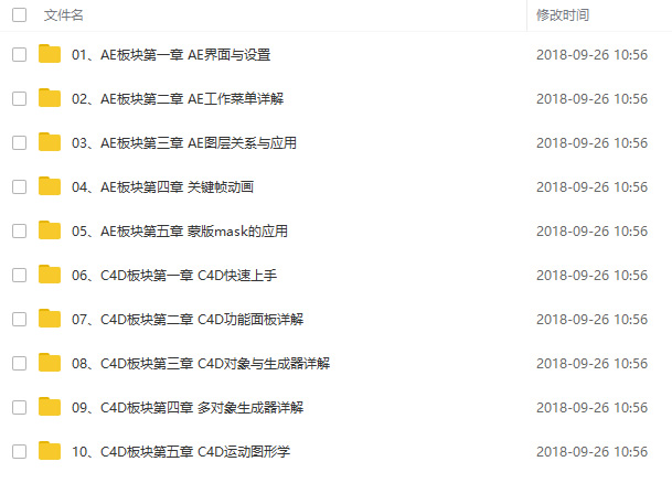 课程按照 AE 和 C4D 各个功能模块进行系统讲解。例如: AE 图层模块、关键帧模块、mask 遮罩模块、3D 空间模块,C4D 的建模系统、运动图形系统、动力学系统、毛发系统、布料系统、灯光材质系统等,并且会对里面“每一个参数选项”都“逐一无遗漏“的进行详细讲解。